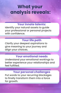 This comprehensive study offers you a deeper understanding of yourself or your loved ones. Through my in-depth analysis (the fruit of 20 years of experience), I decode for you: